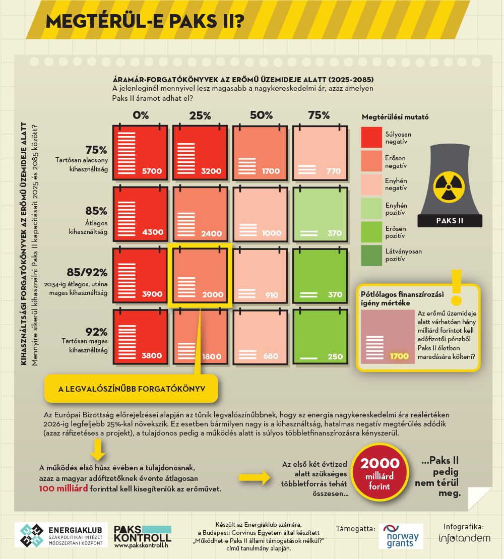 A működés első húsz évében évről-évre átlagosan 100 milliárd forint közpénzzel kellene támogatni az erőműtársaságot annak érdekében, hogy egyáltalán működőképes maradjon, a projekt megtérülése pedig kizárólag valószerűtlenül magas áramárak mellett képzelhető el. Ezek a legfontosabb megállapításai annak a kutatásnak, amelyet az Energiaklub Pakskontroll programjának felkérésére készített Felsmann Balázs, a Corvinus Egyetem Stratégiai és Nemzetközi Menedzsment Kutatóközpontjának vezetője. Mindez homlokegyenest ellentétes azzal, amit a magyar kormány állít.