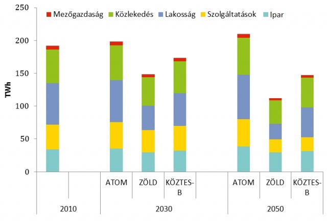 Az alábbi diagram szemlélteti, hogy a zöld és a köztes-B forgatókönyv megvalósulása révén jelentősen tudna csökkenni az ország energiafelhasználása, elsősorban a lakóépületekben elérhető megtakarítások révén. A hivatalos, atom szcenárióban viszont az energiafogyasztás a jelenlegihez képest emelkedne.